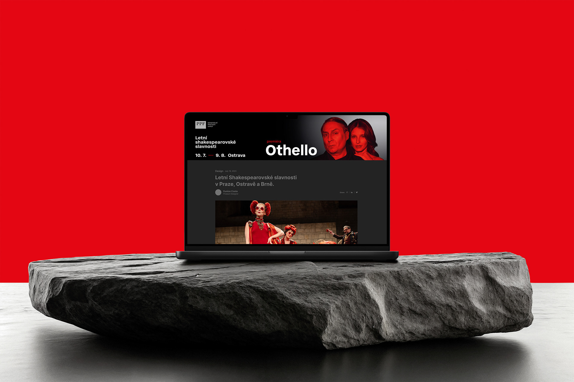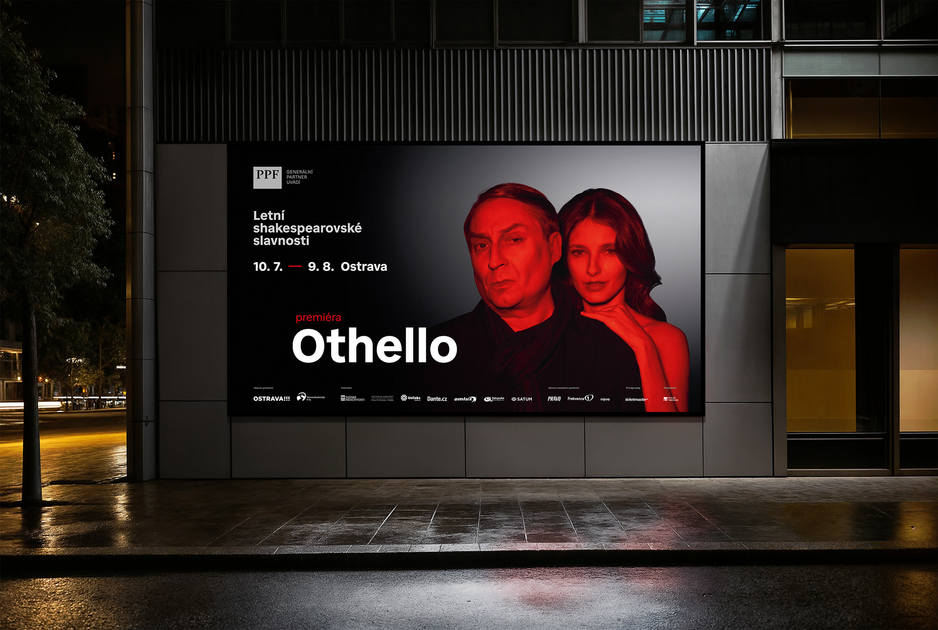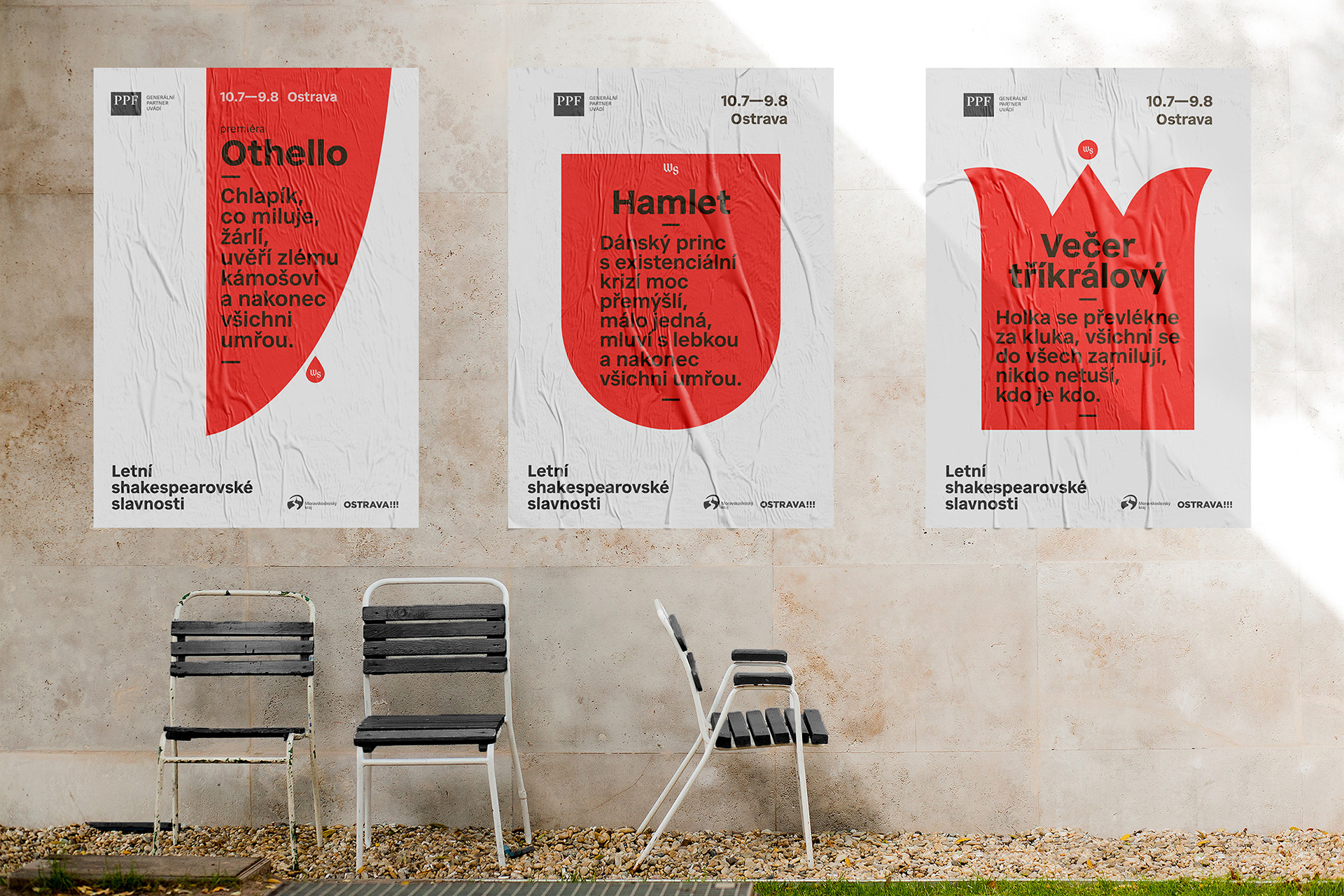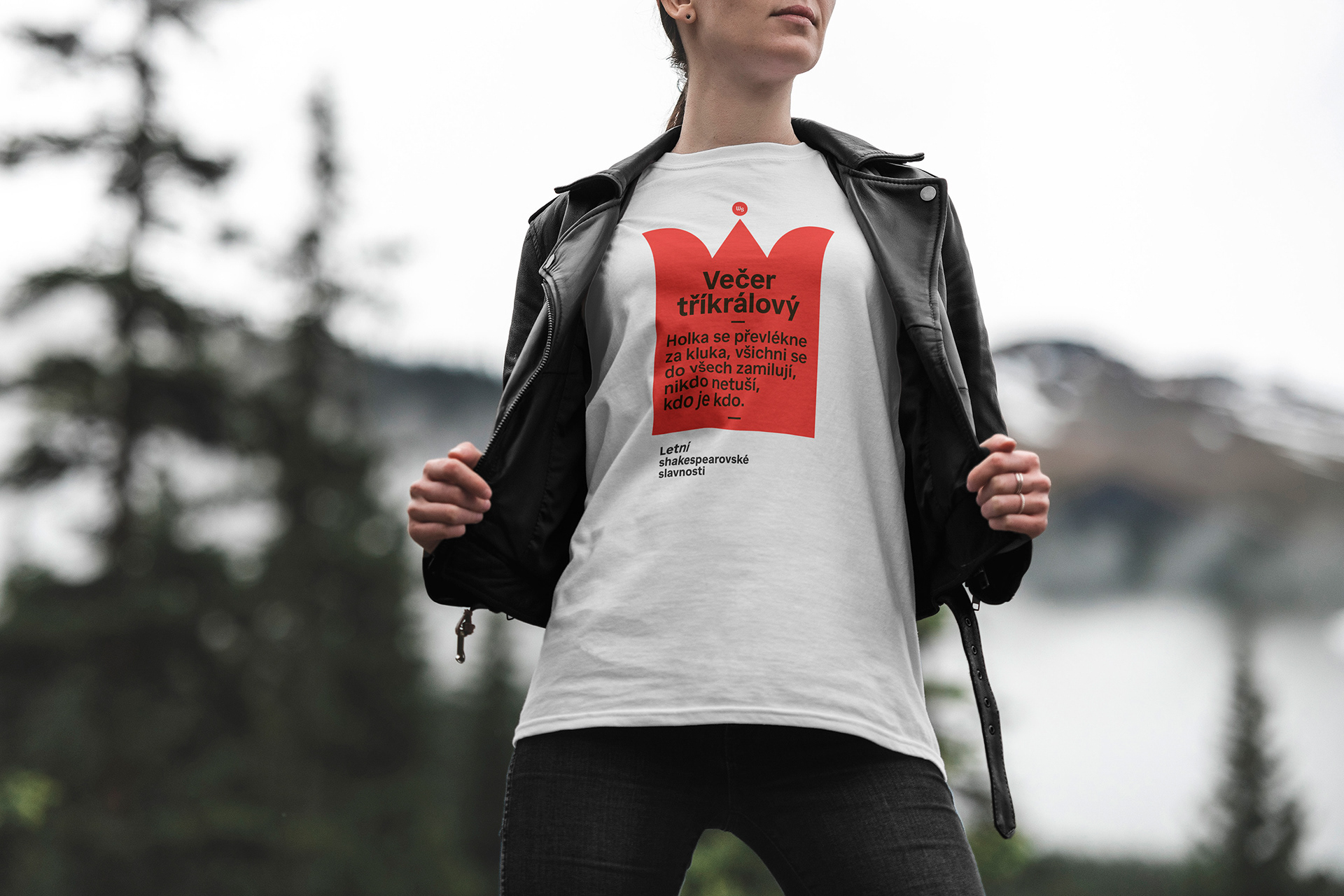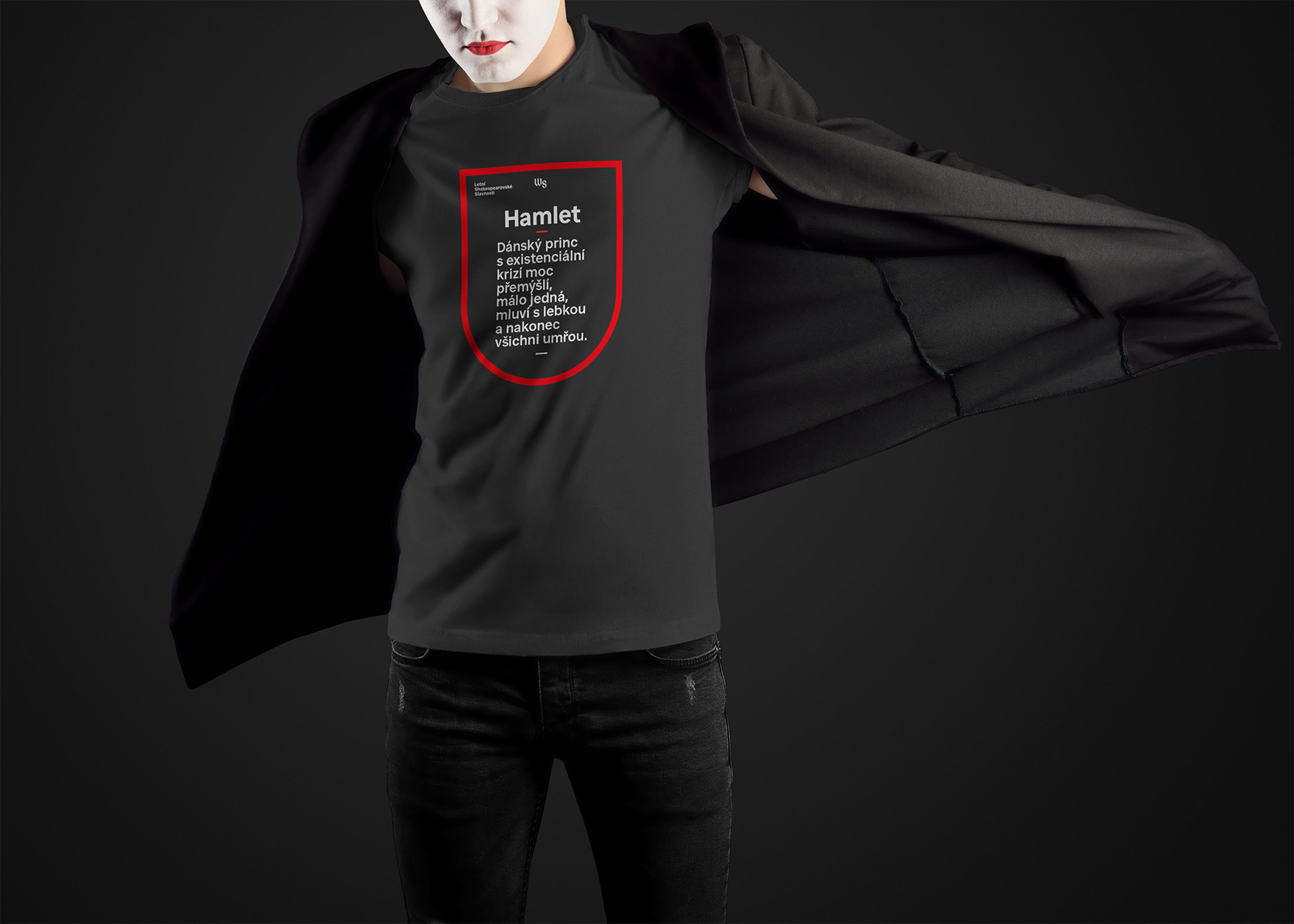 Zůstaly původní fotografie a barevnost, doplněné o aktuální typografii a monogram Williama Shakespeara jako autorskou značku. Nové tvary a symboly odkazují na jednotlivé žánry her: nůž pro Othella, erb pro Krále Leara a koruna pro Večer tříkrálový. Vizuál doplňují krátké úryvky z her – výstižné, poetické a s nadsázkou. Takové malé slovní zrcadlo Shakespearova světa pro dnešní dobu.