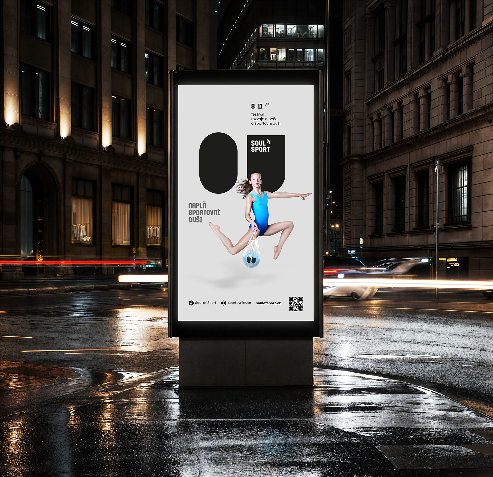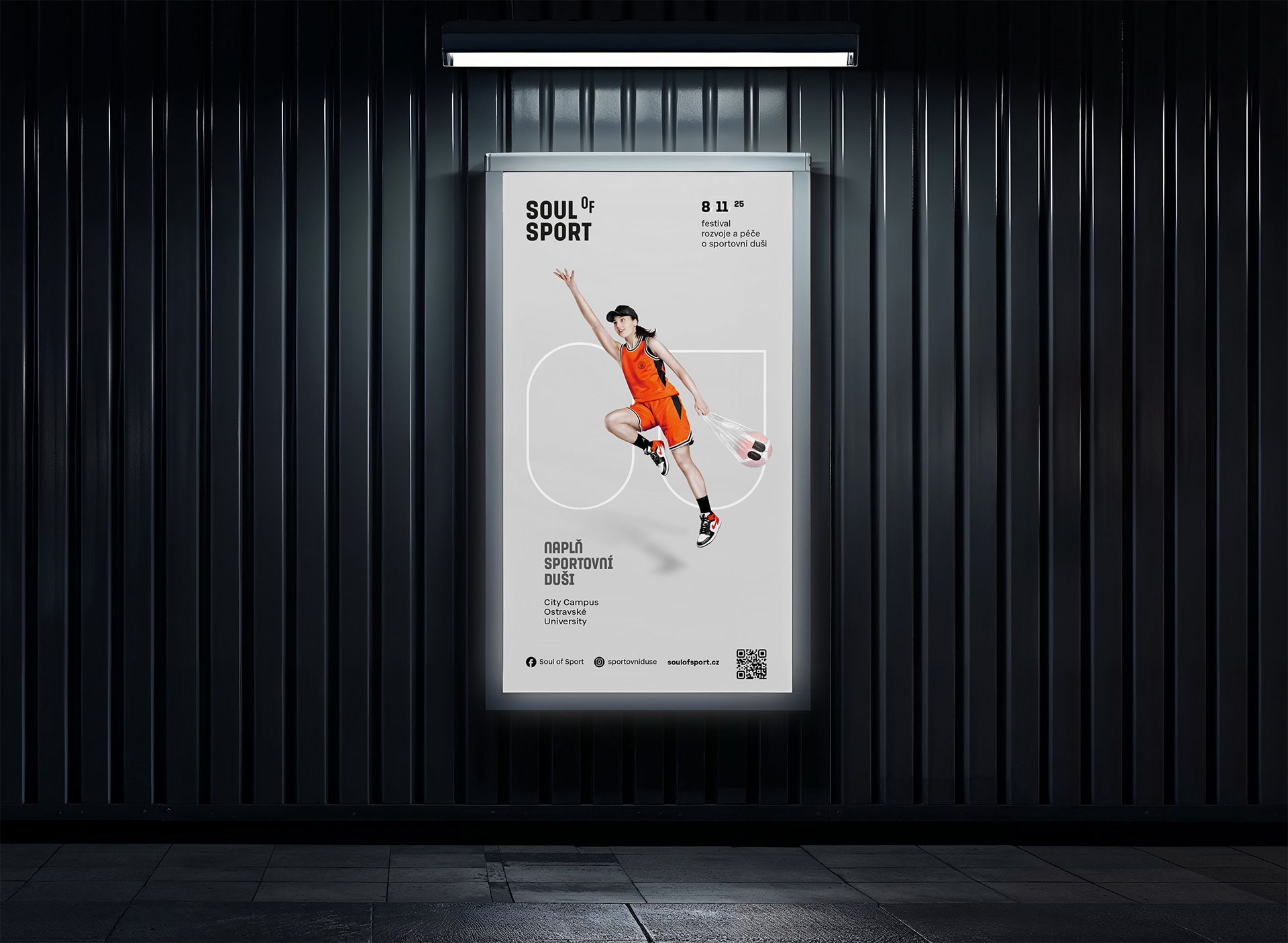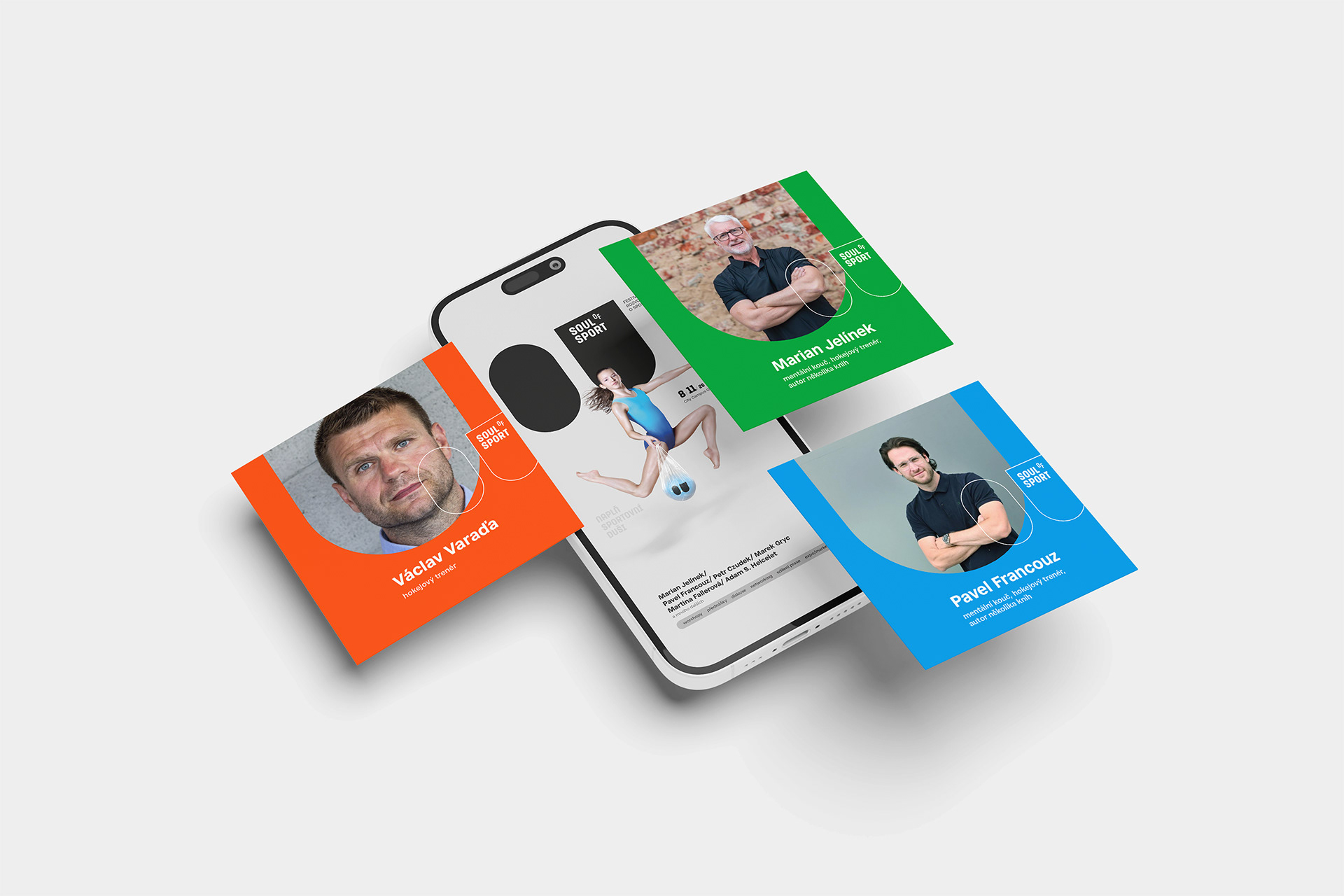 Vizuální identita projektu, který připomíná, že výkon je jen část příběhu. Logo vychází z písmen OU – očí sportovní duše – a doplňuje ho typografie s vznášejícím se „o“, symbolem lehkosti a nadhledu. Fotografický styl propojuje postavy s jejich duší, ukrytou v igelitce s balónem a očima. Barevnost čerpá z typických sportovních povrchů: oranžové kurty, modré haly a zelené trávníky.