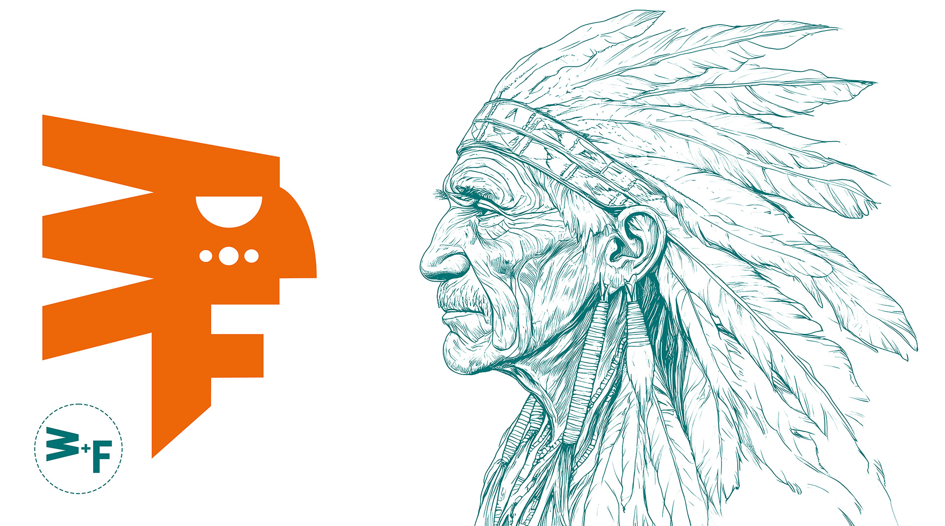 Logo jsme zasadili do tvaru indiánského štítu, symbolu odvahy a ochrany. Znak kombinuje písmena W (čelenka z per) a F (tvář), čímž vzniká jednoduchá, silná značka s příběhem.